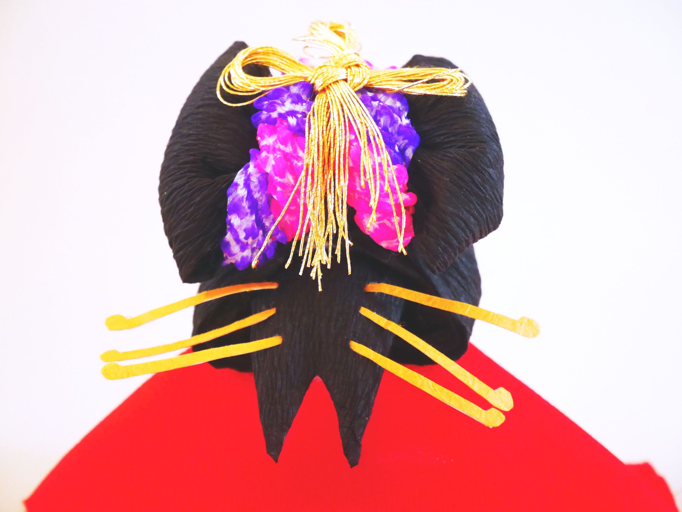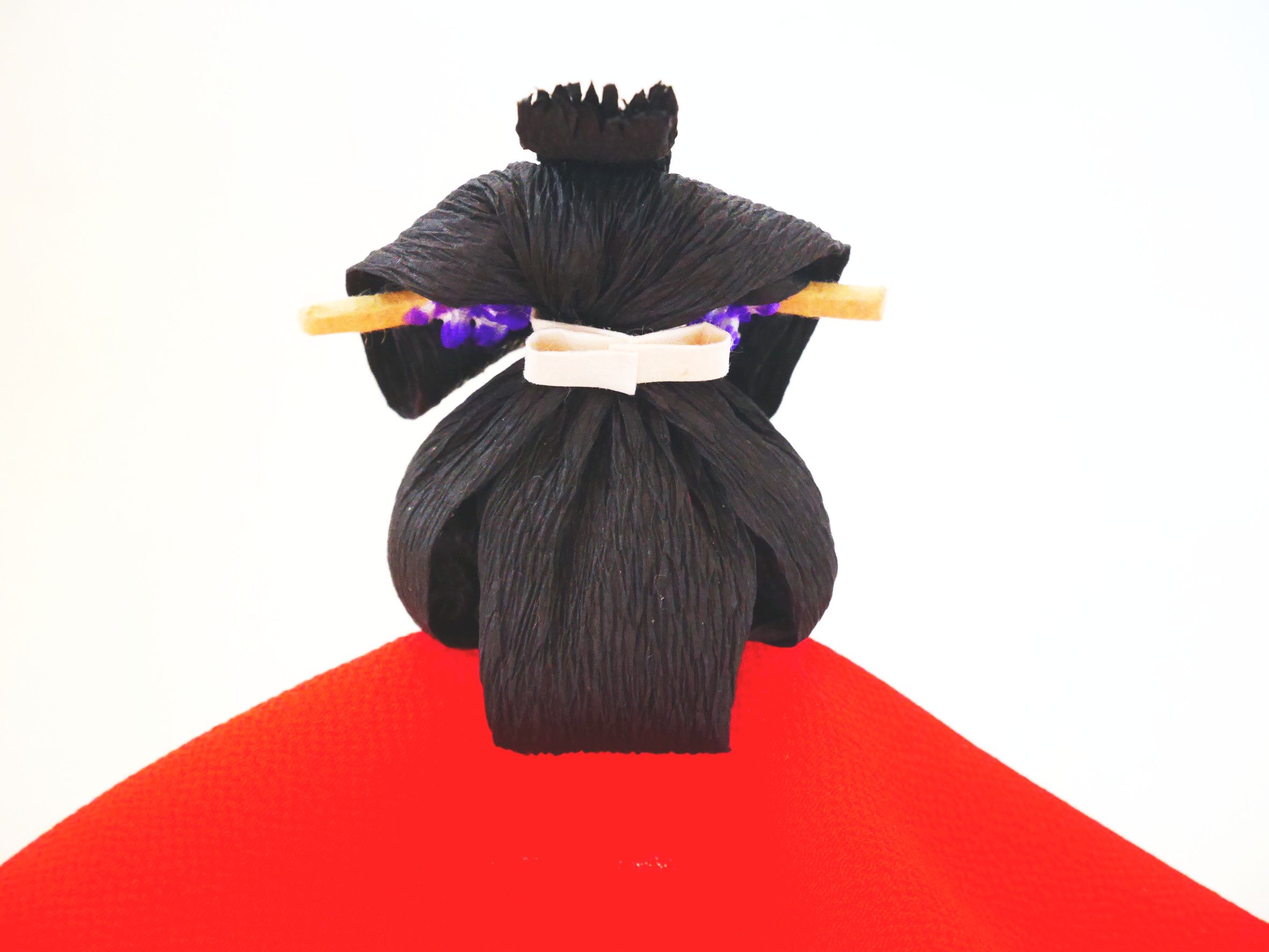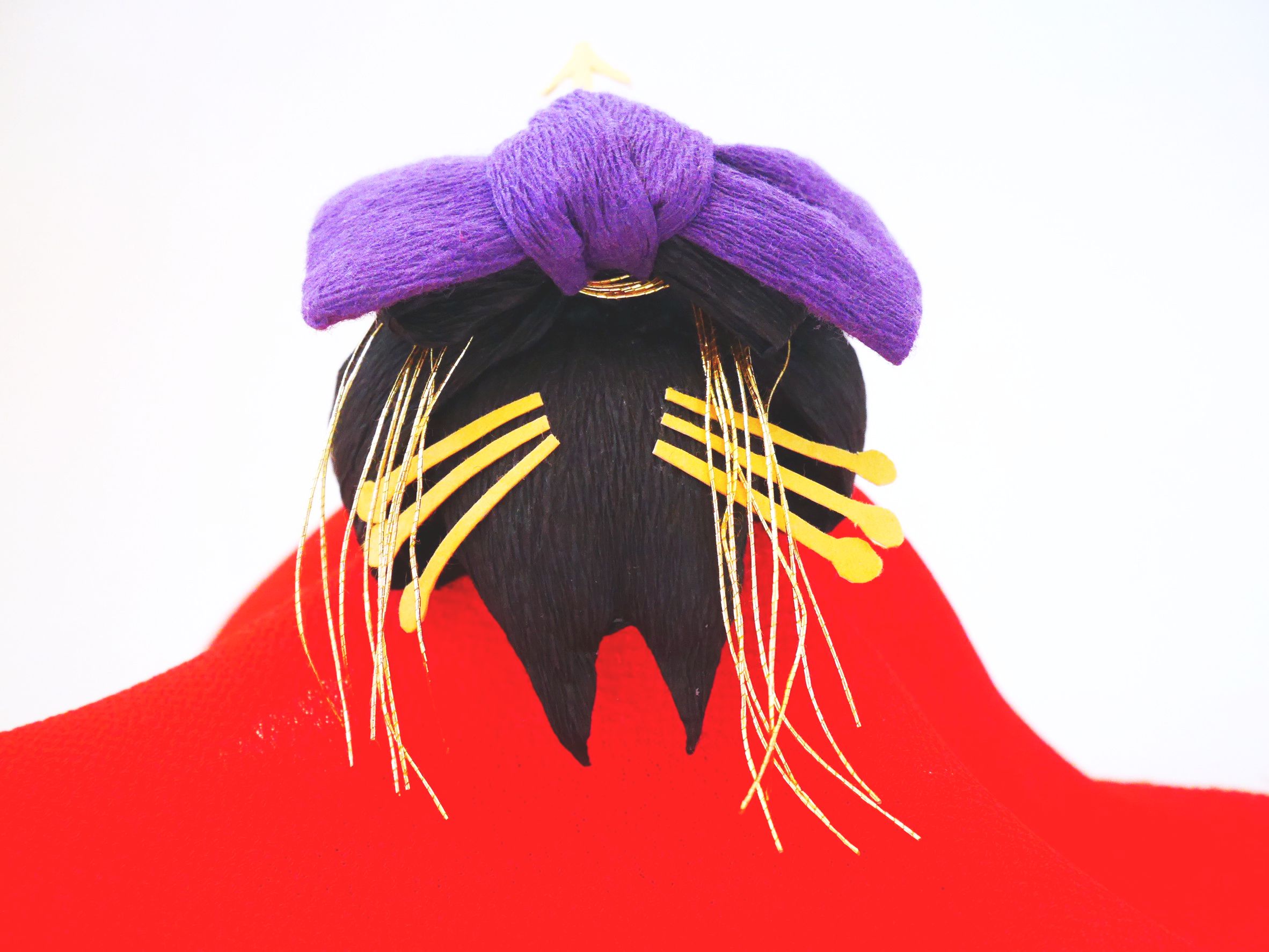 花魁の結う髷。根元に笄を立てて髪を巻き付け、紫のちりめんをリボンの様にかけている。
